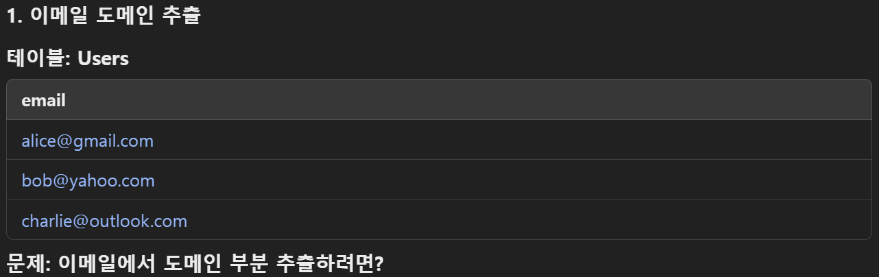SELECT email, SUBSTRING(email, LOCATE('@', email) + 1) AS domain