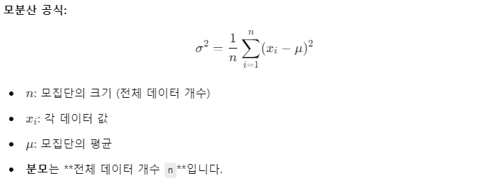 - 모분산(Population Variance): 모분산은 전체 모집단의 분산을 계산할 때 사용된다. 모든 데이터를 알고 있는 경우, 즉 전체 모집단에 대해 계산하는 경우 사용된다.