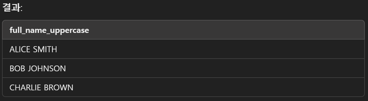 "UPPER" 함수는 문자열 데이터를 대문자로 변환하는 함수입니다. 문자열의 모든 소문자를 대문자로 바꾸고, 대문자는 그대로 유지합니다. 주로 데이터 정규화, 검색 조건 통일, 또는 출력 형식을 맞추는 데 사용됩니다.