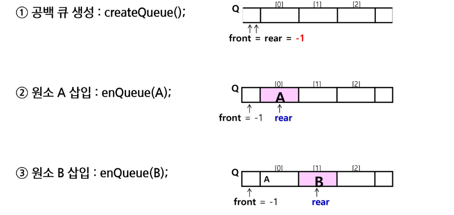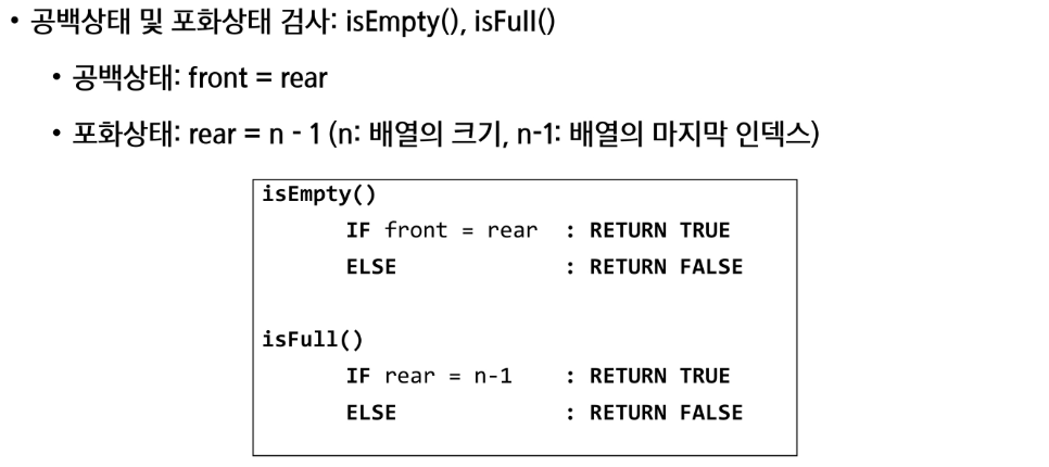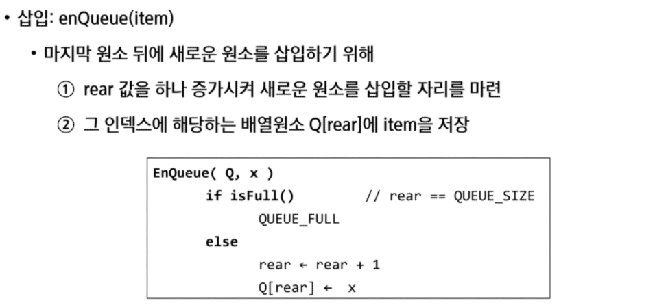 - 스택과 마찬가지로 삽입과 삭제의 위치가 제한적인 자료구조