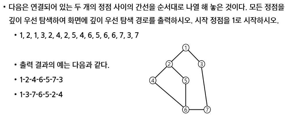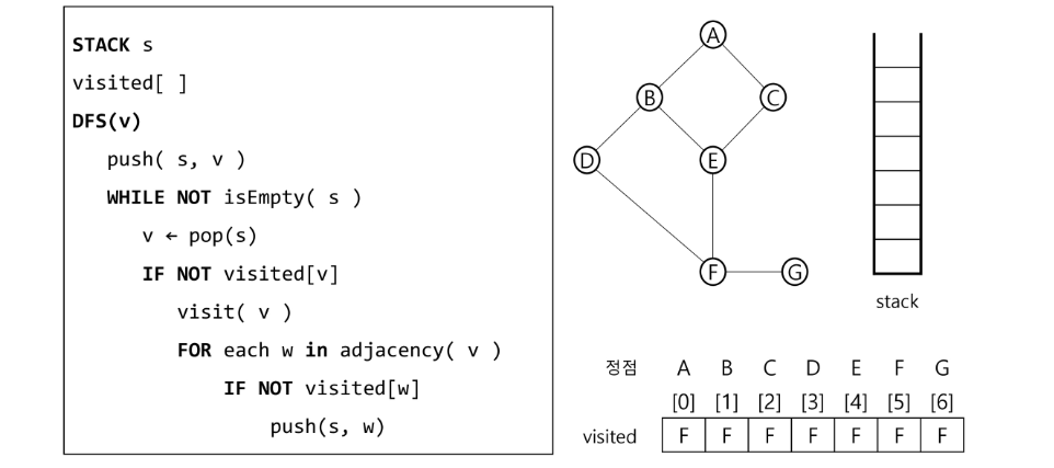 - 가장 마지막에 만났던 갈림길의 정점으로 되돌아가서 다시 깊이 우선 탐색을 반복해야 하므로 후입선출 구조의 스택을 사용합니다.